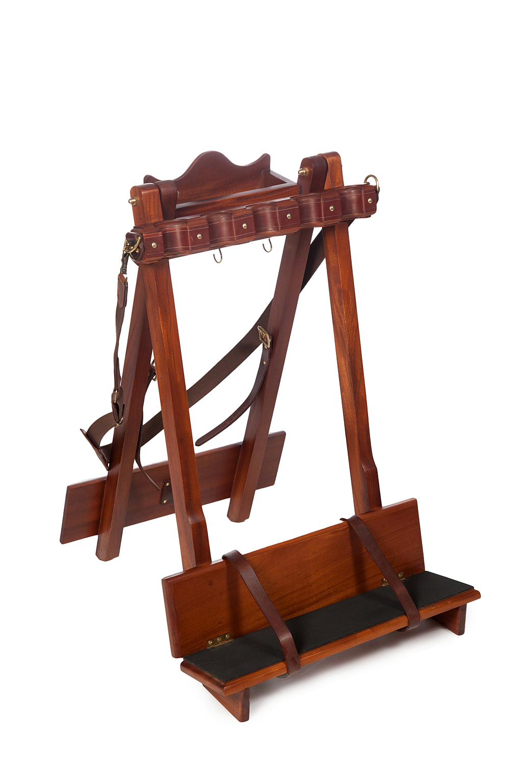 More than just a field side rack for polo sticks. Also brilliant for fishing rods or the likes of your guns at a clay pigeon range or at tea on a driven shoot. Made with solid brass fittings, a rubber mat on the base, and brass hooks for hanging equipment and gloves. It has a detachable carry strap as well as a protective cushion on the base for anything placed on the rack.