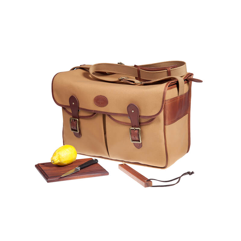 Canvas & Leather on the outside, cooler lined on the inside fashioned with extra large pockets and brass hardware. Thoughtfully constructed with a shoulder strap strong enough to tow a Land Rover. Comes standard with chopping board and Kenyan style bottle opener.